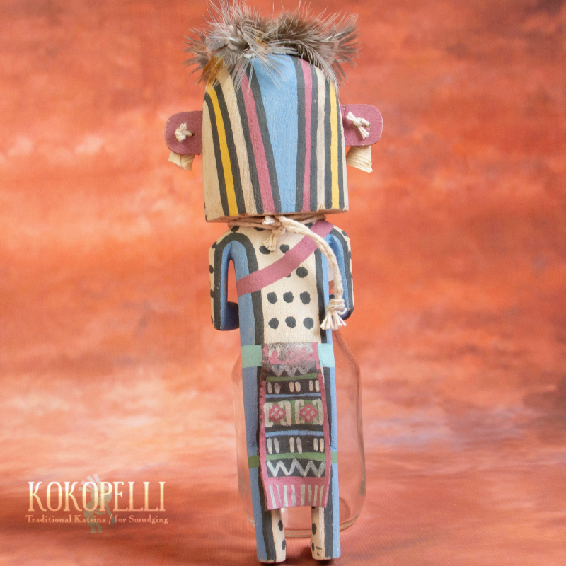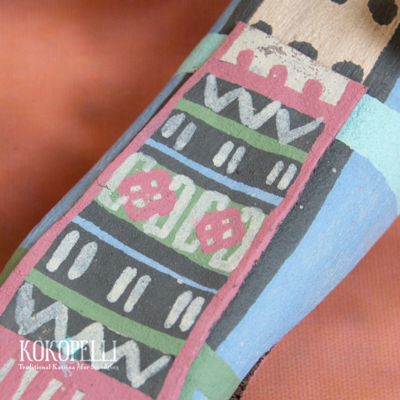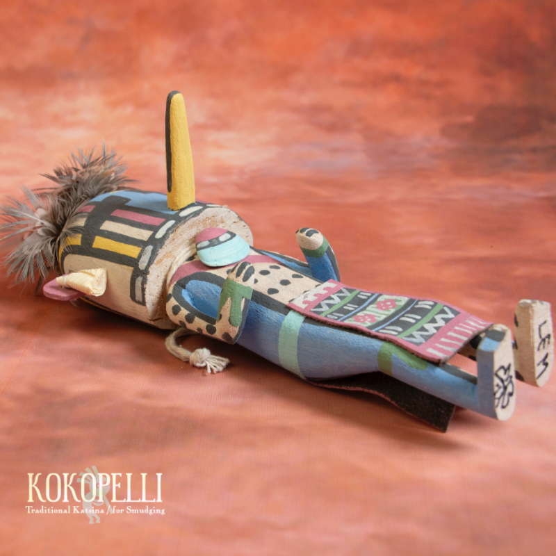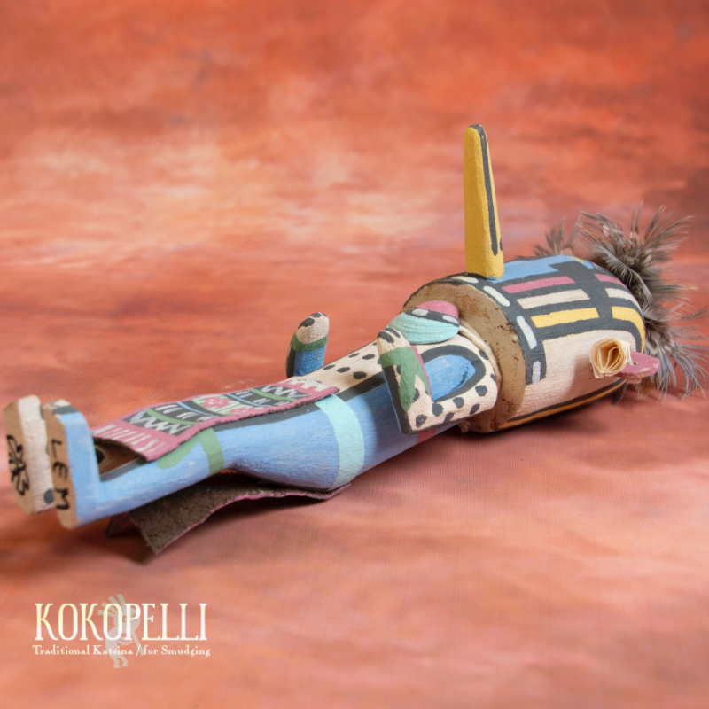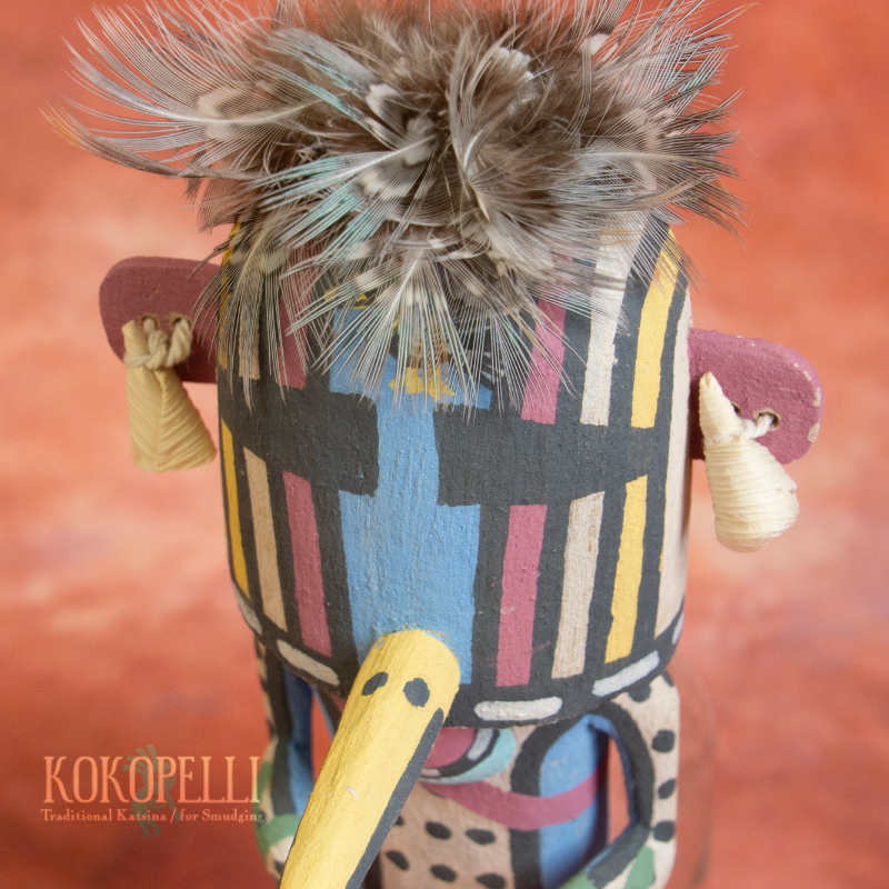 このカチナにはkilldeer(チドリ)という別名がありますが、長い嘴と体の模様からsnipe(シギ)の方が正しいと思われます。キヴァダンスに現れる鳥系カチナの一員ですが、腰巻きしか身につけていないことからレーサーカチナでもあることが伺えます。